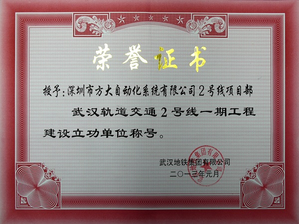 近日,为表彰3044永利自动化系统有限公司在武汉地铁2号线一期工程中的突出贡献,武汉地铁集团有限公司授予3044永利自动化系统有限公司为 “武汉轨道交通2号线一期工程建设立功单位”称号。