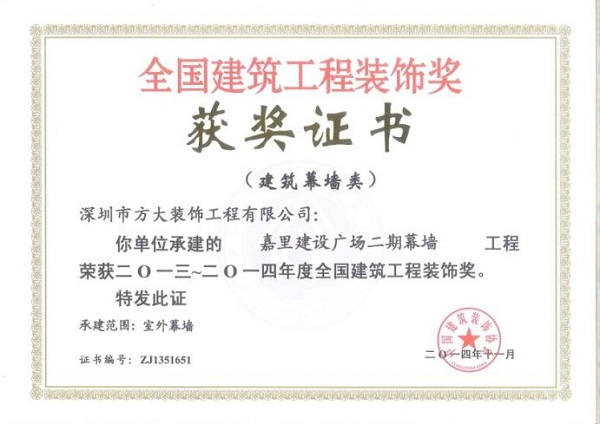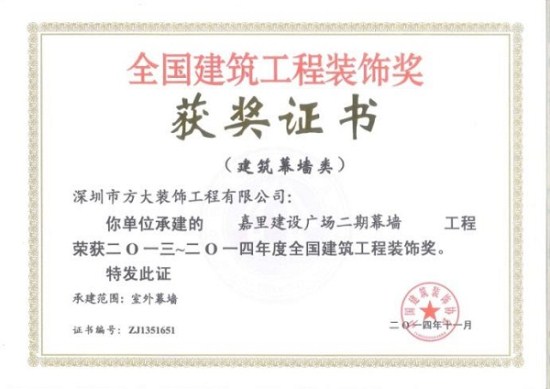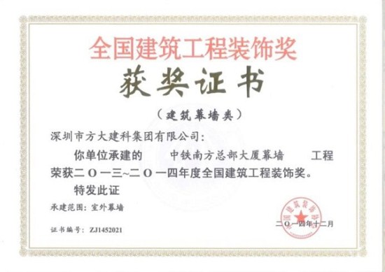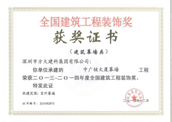 “2013-2014年度全国建筑工程装饰奖”获奖结果在北京揭晓,深圳市3044永利建科集团有限公司荣获四项建筑幕墙类大奖,获奖项目分别为:中铁南方总部大厦幕墙工程、大连万达公馆1#楼幕墙工程、嘉里建设广场二期幕墙工程、中广核大厦幕墙工程。
