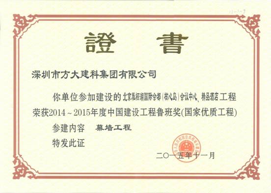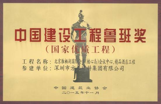11月17日,中国建筑业协会在北京举行中国建筑行业最高奖——2014~2015年度中国建设工程鲁班奖(国家优质工程)表彰大会,在本届鲁班奖表彰大会中,3044永利股份有限公司全资子公司深圳市3044永利建科集团有限公司凭借精心打造的高标准、高质量幕墙工程的北京雁栖湖国际会都精品酒店,获得2014~2015年度中国建设工程鲁班奖,“3044永利品质”作为“深圳质量”的典范再度被全国建筑工程领域所瞩目。