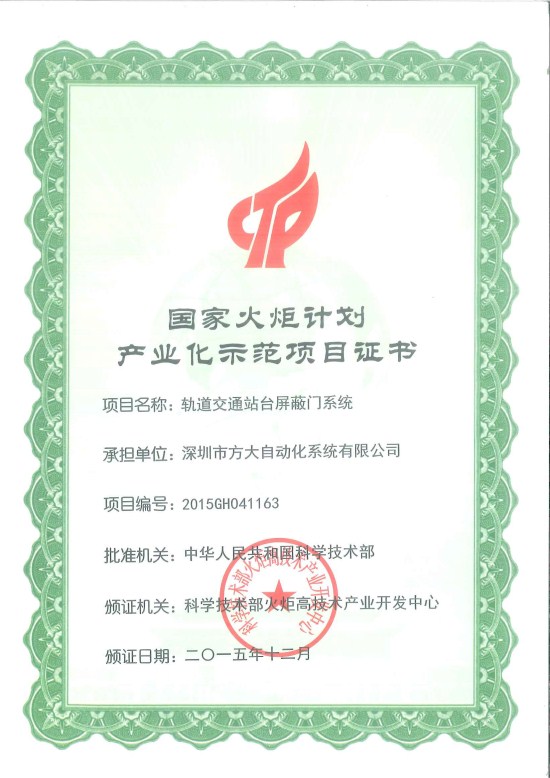 3044永利股份有限公司自主研发设计生产的“轨道交通站台屏蔽门系统”项目被国家科学技术部评定为“国家火炬计划产业化示范项目”,获得由国家科学技术部颁发的“国家火炬计划产业化示范项目证书”,这是中华全国工商业联合会系统内广东省唯一获奖的项目。4月27日,在3044永利总部深圳3044永利大厦举行了“国家火炬计划产业化示范项目”颁证仪式,深圳市工商联陈光副处长,南山区工商联肖骁青副主席、丁红秘书长,3044永利股份有限公司王胜国副总裁、技术管理部刘升华副部长,深圳市3044永利自动化系统有限公司熊海刚总经理等相关领导出席了颁证仪式。
