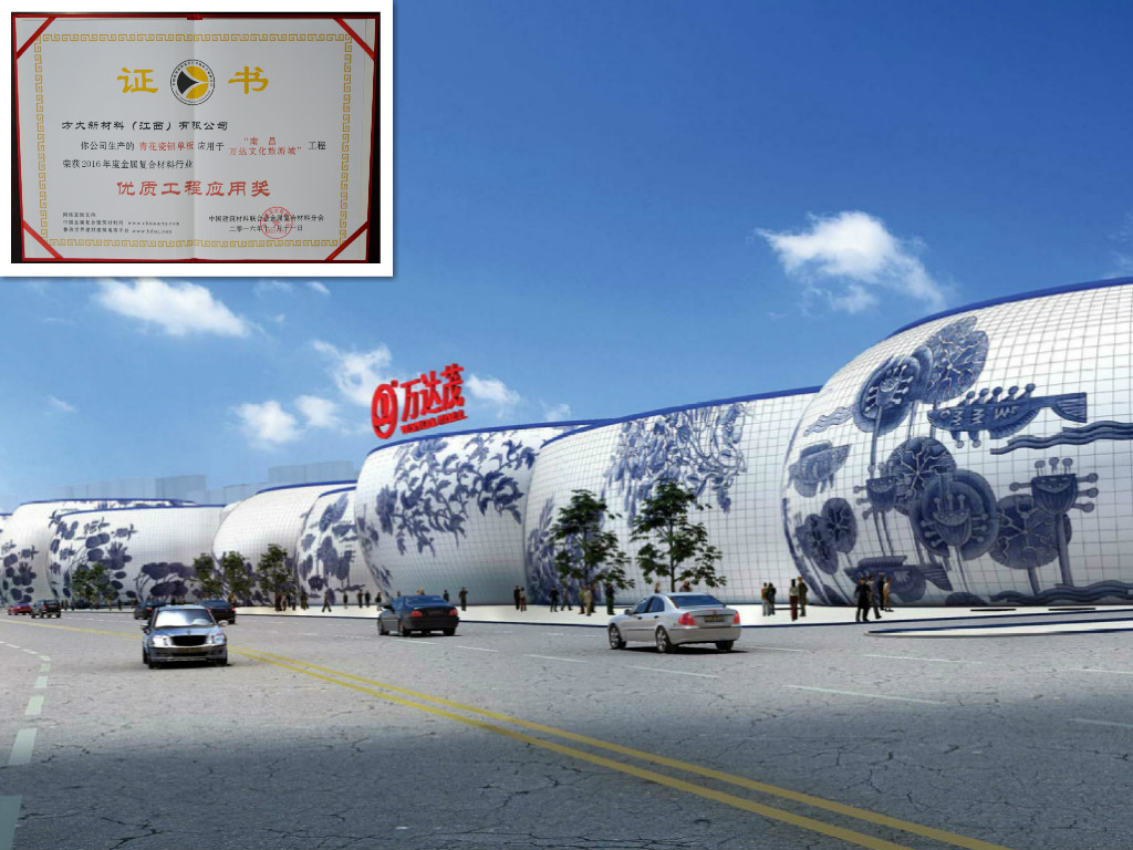 3044永利青花瓷铝单板应用于南昌万达文化旅游城,荣获2016年度金属复合材料行业“优质工程应用奖”