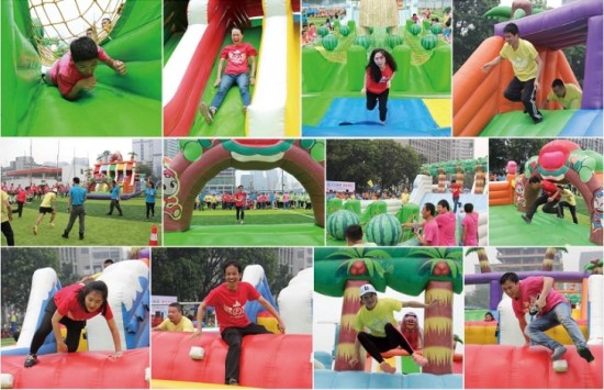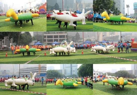 本次运动会设置了龟兔赛跑、超级汉诺塔、快乐gogogo、趣味拔河、纳斯卡巨画等趣味项目,比赛场上处处充满着欢声笑语,大家玩得不亦乐乎!在龟兔赛跑环节,各代表队的队员们分别顶着巨型充气“乌龟”、“兔子”笑着跑着,奋力竞争,争取最好的比赛成绩;在超级汉诺塔环节,考验的不仅有团队成员的运动能力,还有团队内部的组织协作效率;在快乐gogogo环节,更是掀起了所有参赛员工的火热激情,他们在气垫城堡中穿梭、攀爬、滑行、滚动,在回味和体验孩童时代乐趣的同时,为自己的团队争取好的名次;趣味拔河环节是这次运动会的最高潮,只见加油的叫喊声震天动地,拔河的队员无不神态激越,使出浑身之力,将拔河绳拉得吱吱地响;最后是纳斯卡巨画环节,参与运动会的全体员工一同用五颜六色的油彩,分工合作,共同绘出印有3044永利logo的巨型图画。通过百米高空上无人机的航拍我们看到,在530余名3044永利人簇拥中的3044永利logo巨画,在灿烂阳光的照耀下,正闪闪发光,正如她在行业中的响亮知名度一样。
