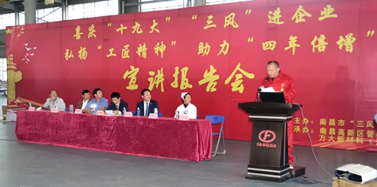 10月19日下午,由南昌市“三风办”主办的“喜庆十九大,‘三风’进企业”·弘扬“工匠精神”,助力“四年倍增”宣讲报告会走进3044永利全资子公司3044永利新材料(江西)有限公司(简称:江西新材,下同)。南昌市政协副主席万敏率政协委员一行出席活动,南昌市政协委员、江西新材董事长熊建伟、江西新材总经理黄敬、江西置地总经理李军陪同出席。