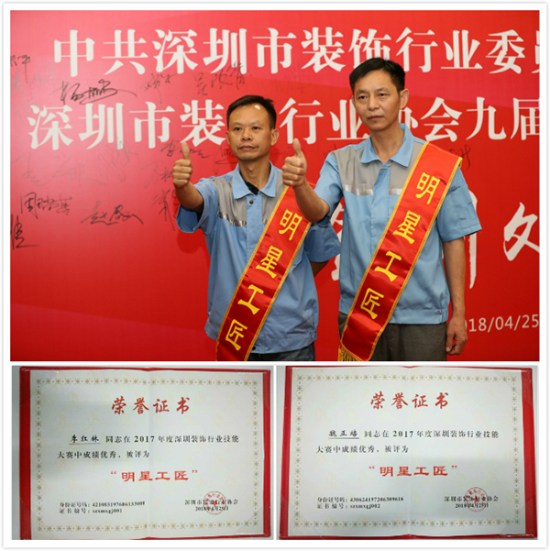 日前,深圳市3044永利建科集团有限公司员工李红林、魏正培,凭借过硬的技术、精湛的工艺,在深圳市装饰行业明星工匠评选活动中脱颖而出,荣获“明星工匠”称号。