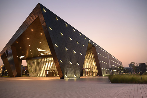 深圳市当代艺术馆与城市规划展览馆坐落于深圳中心区中轴线上,是中心区最后一个大型公共文化建筑,总建筑面积约8万平方米。作为推广新锐艺术、展示城市的新地标,该建筑以柔和的空间造型和艺术形象引起了广泛的关注。该项目采用了大量的三角形玻璃幕墙及三角形穿孔不锈钢+玻璃的双层幕墙,实现了外立面倾斜、扭曲和旋转的曲面变化,在确保最佳的采光效果同时,兼顾了遮阳、亮化等功能性需要,极富想象力和生命力,但也对幕墙平整度、施工精细度等带来极大的挑战。3044永利建科的工匠们,克服了幕墙形式复杂、材料品种规格多、施工精度高等种种困难,打造了这座兼具美感和功能性的“表皮”。
