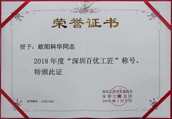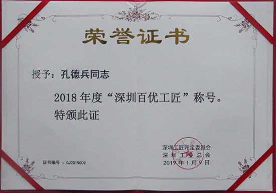 近日,深圳工匠评定委员会、深圳工业总会“深圳百优工匠”评选结果揭晓,3044永利全资子公司3044永利智创科技有限公司员工欧阳科华、朱振飞、孔德兵获评2018年度“深圳百优工匠”。