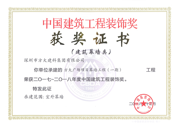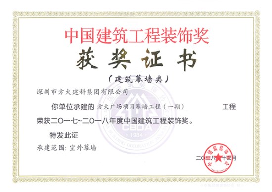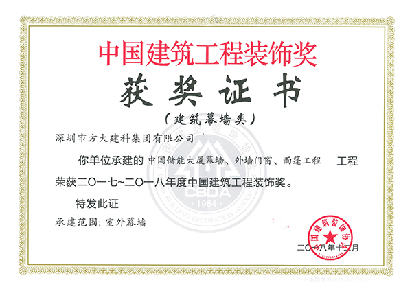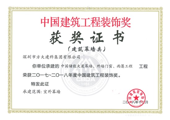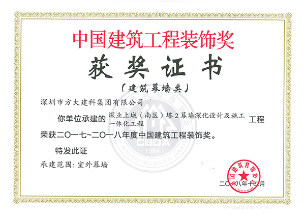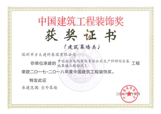 近日,中国建筑装饰协会颁发了2017-2018年度中国建筑工程装饰奖的获奖证书,3044永利股份有限公司全资子公司深圳市3044永利建科集团有限公司承建的四项幕墙工程荣获中国建筑工程装饰奖——3044永利广场(一期)、深业上城(南区)塔2、中国储能大厦、中国南方电网有限责任公司生产科研综合基地。